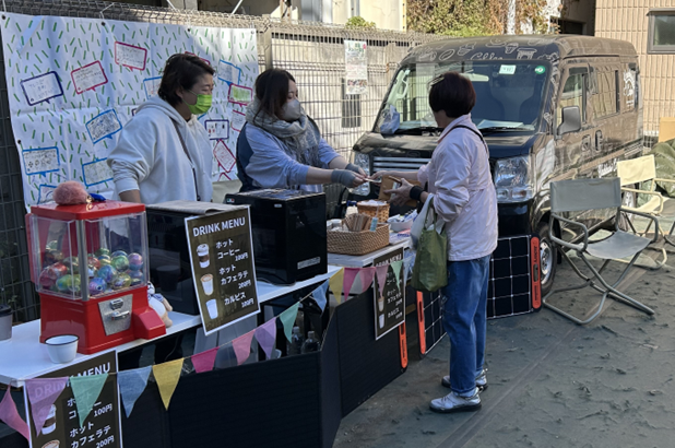東べんてん橋公園隣の空き地では、菜園の野菜収穫や手入れを体験。イスやガスストーブを備えたくつろぎスペースも用意され、訪れた人々がのんびりと過ごしました。牛乳パックを使ったホイッスルづくりや、コーヒーを販売するカフェカーも登場し、会場はにぎやかな雰囲気に包まれました。